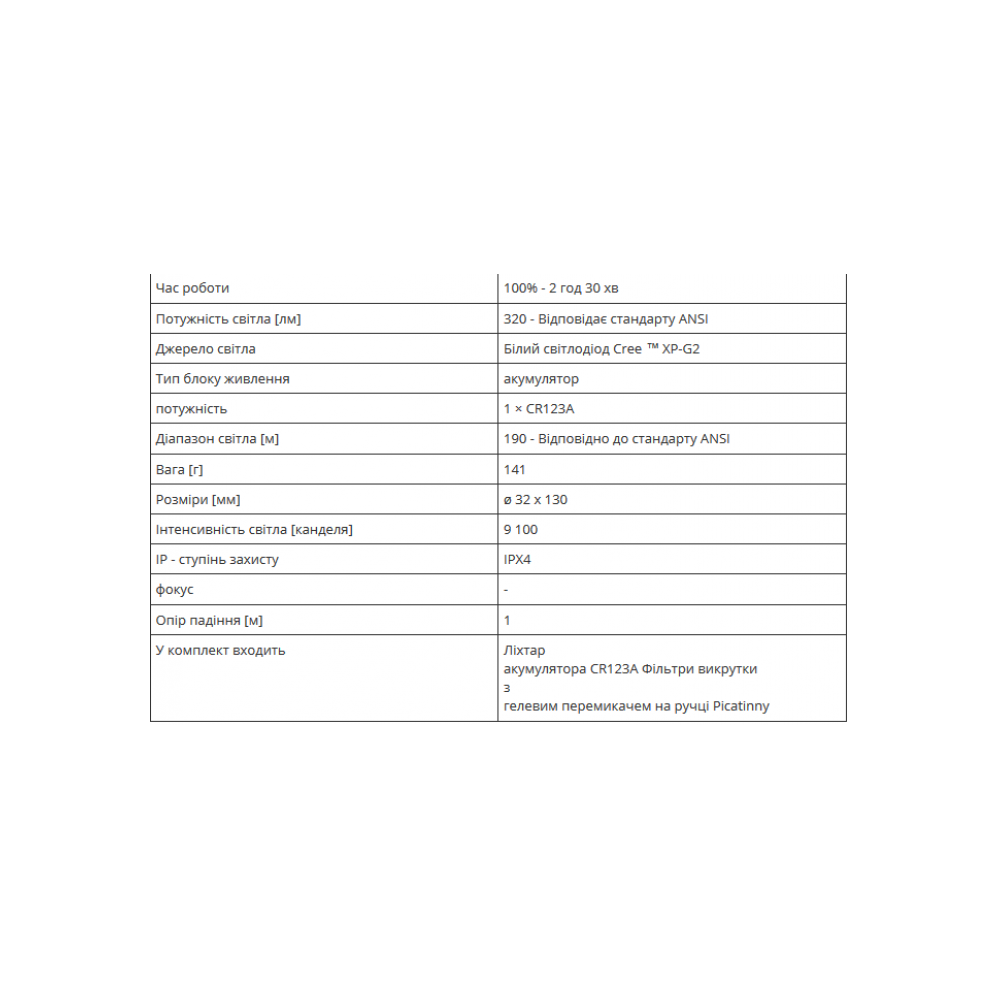 кожну деталь під час виконання завдань. Використання двох акумуляторів CR123A дозволяє вам насолоджуватися повною потужністю світла протягом 2